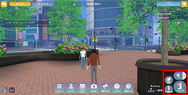 画面右下に4つのボタンがあり、それぞれのボタンからジャンプや手を挙げる、拍手などの行動をアバターにさせることができます。