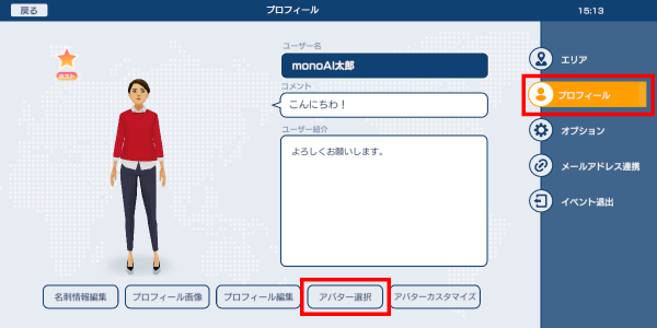 「プロフィール」を押し、自分のプロフィールを表示します。画面下の「アバター選択」を押します。